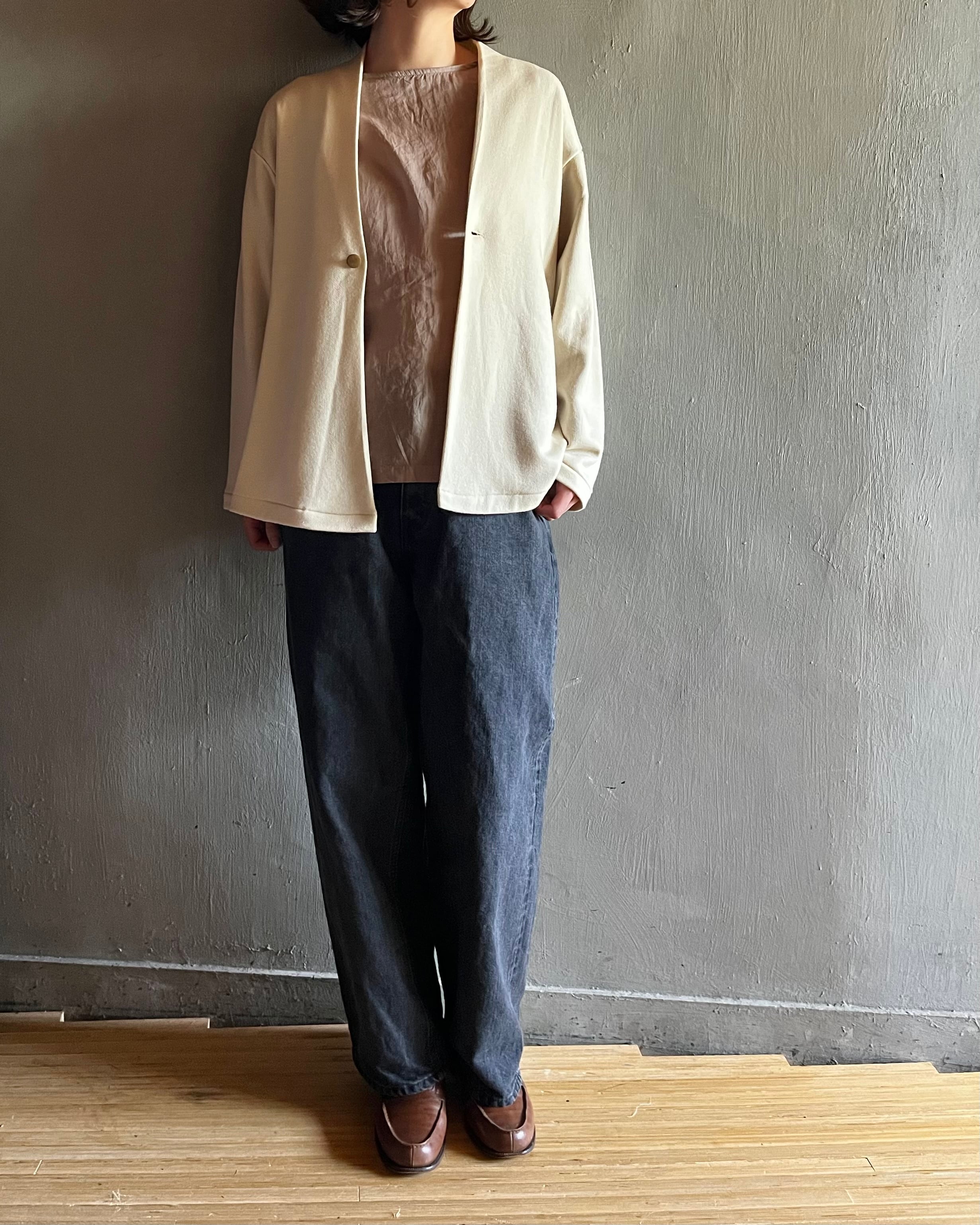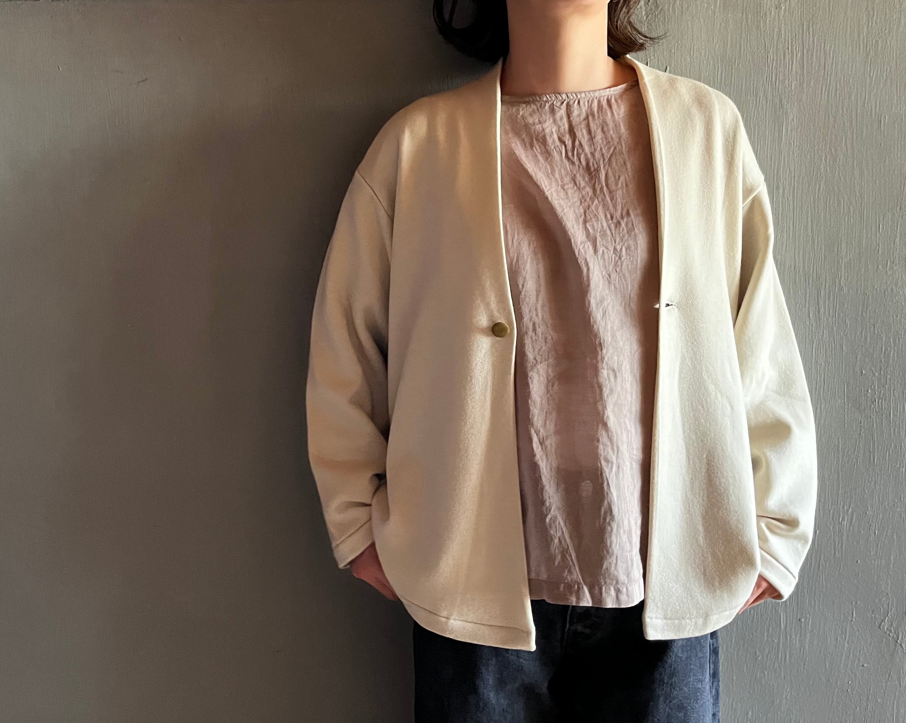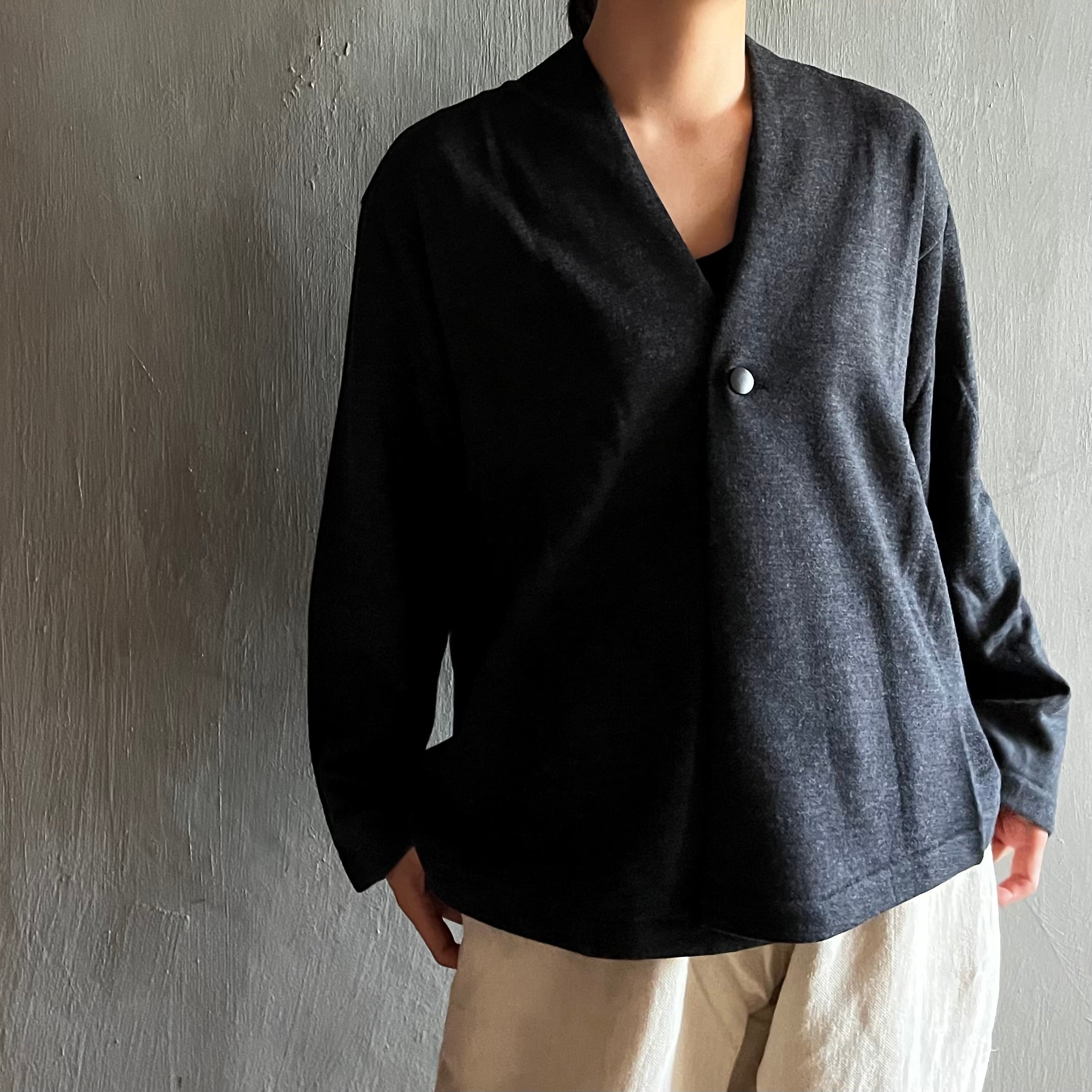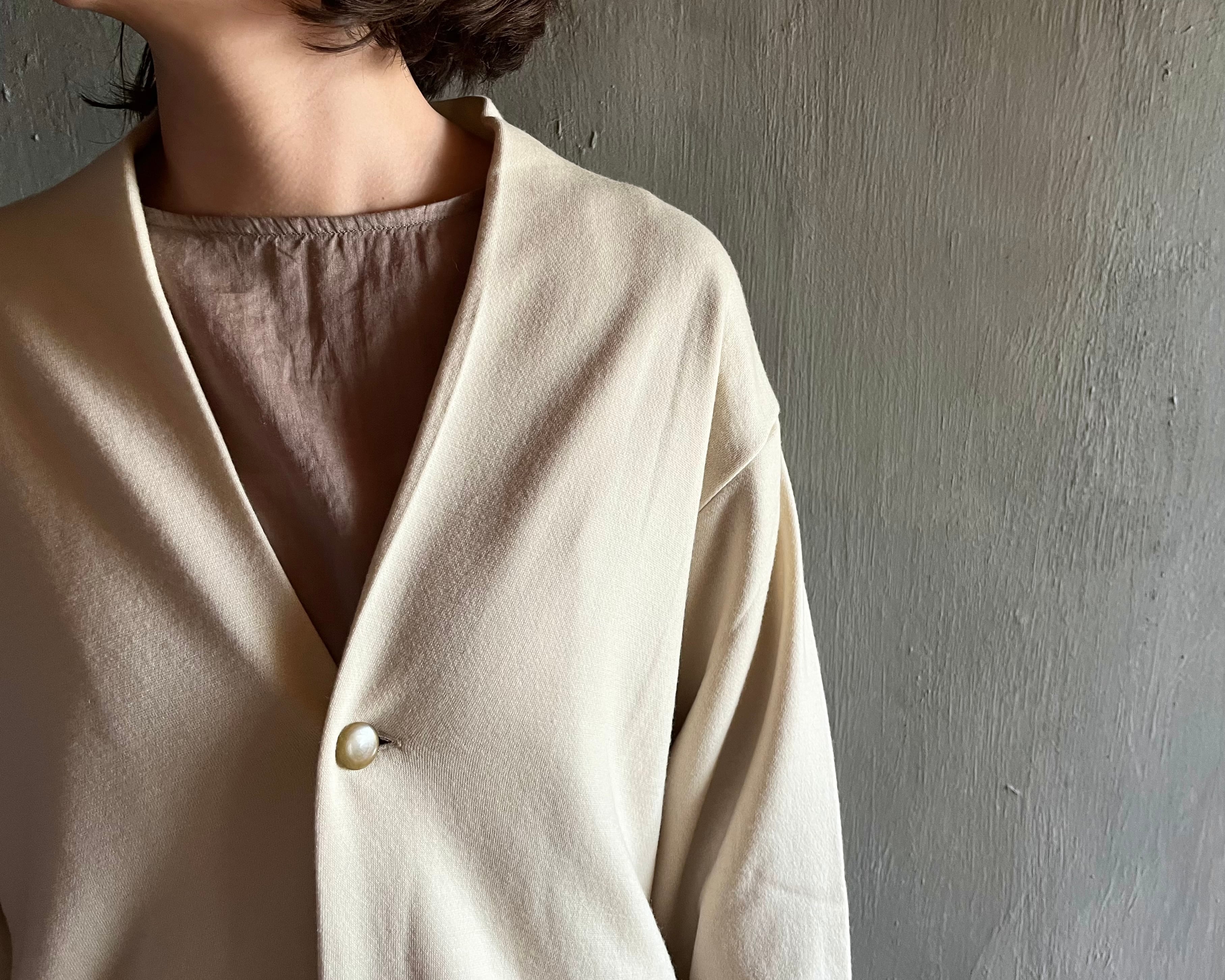 着物のような裁ち続きの衿が特徴のカーディガンです。端を続きにした見返しなど、デザインを最小限に抑えたミニマルなデザインです。ボタンにはタグワヤシを原料としたナットボタンを使用しています。