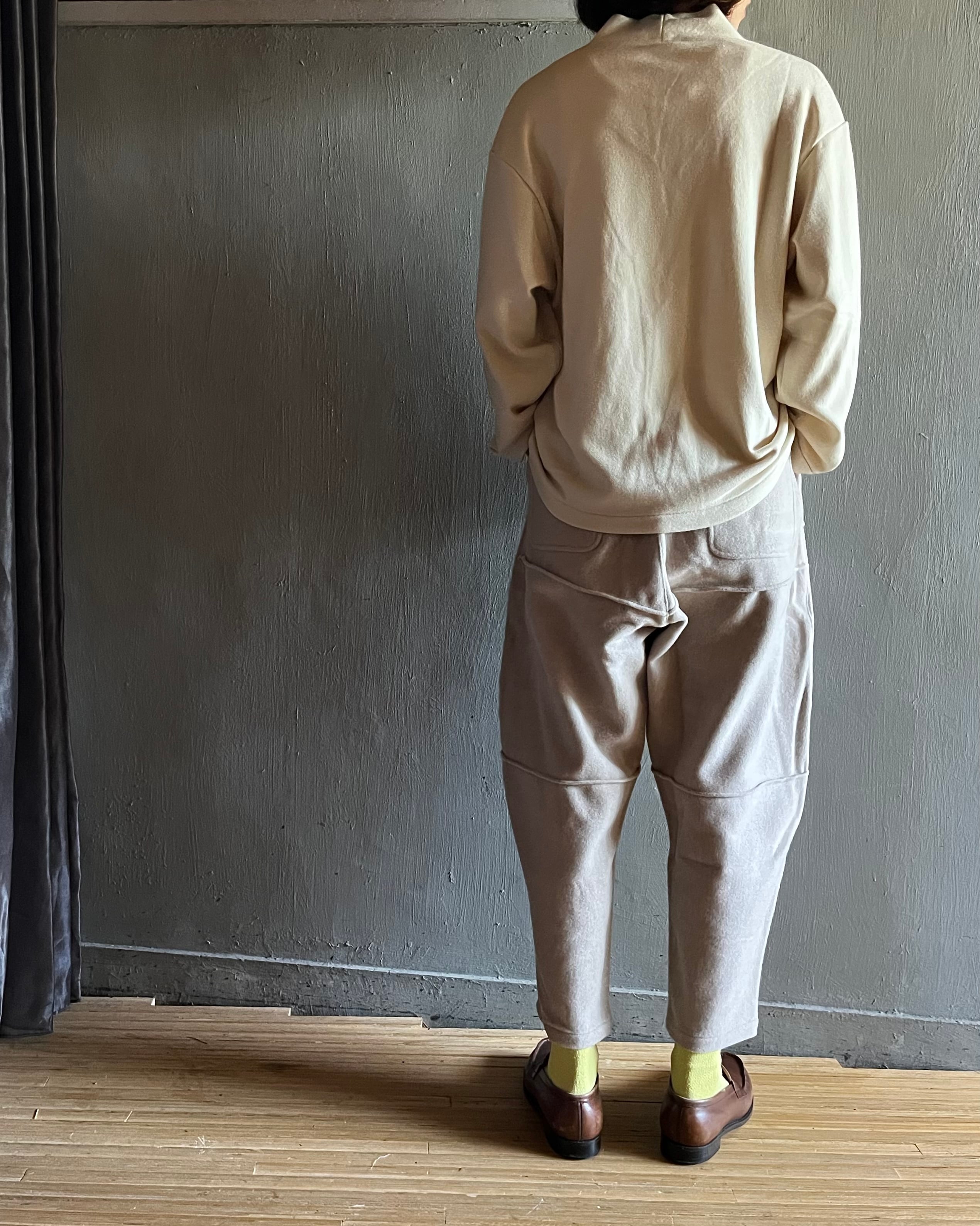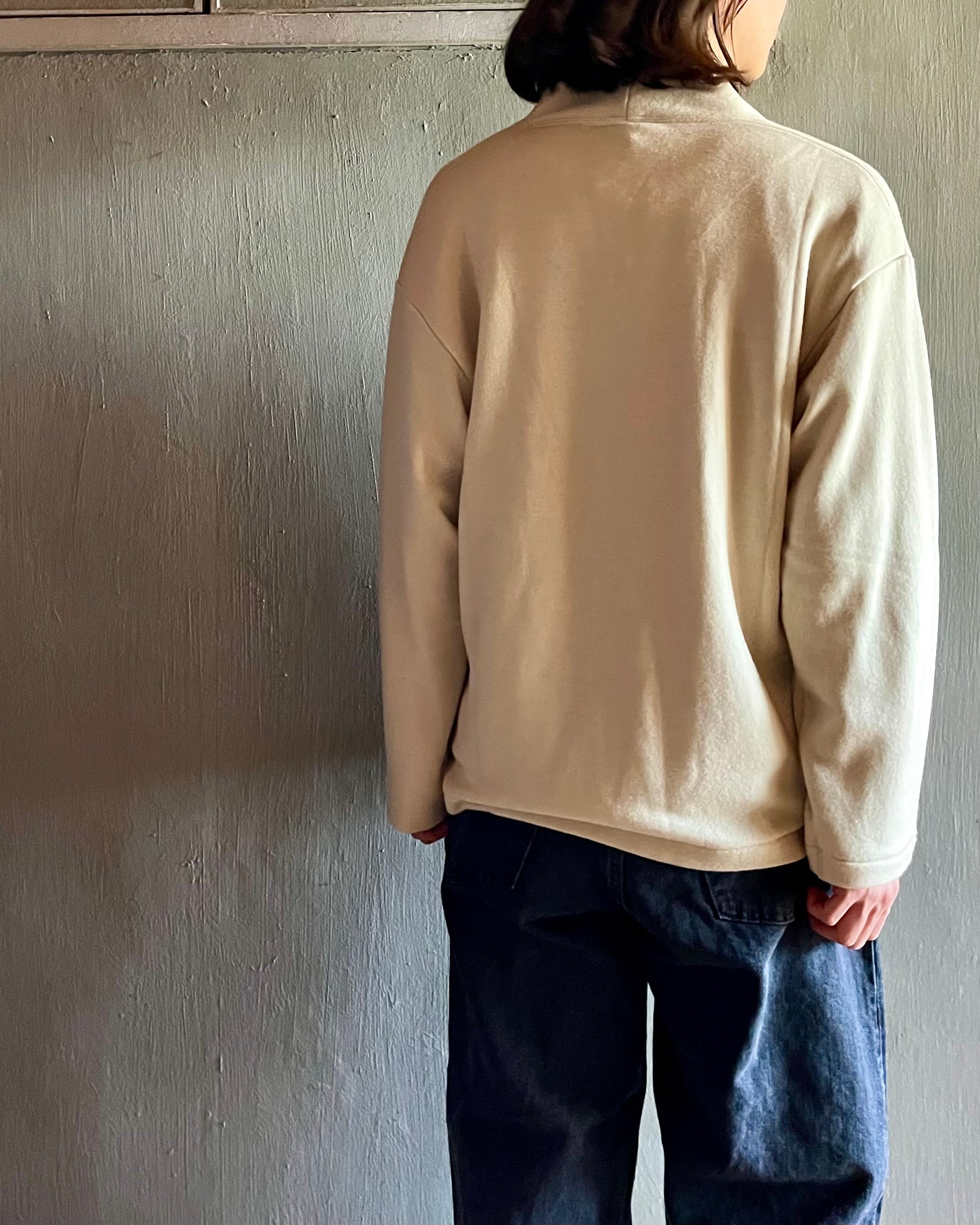 Super 120’sという非常に繊細なウールの原料を使用し、表面と裏毛にも同素材の糸を贅沢に使っています。この繊細さを生かしながらも、長い季節に着用できる程よい肉厚を表現しています。肌当たりは非常に柔らかく、保温性も兼ね備えています。