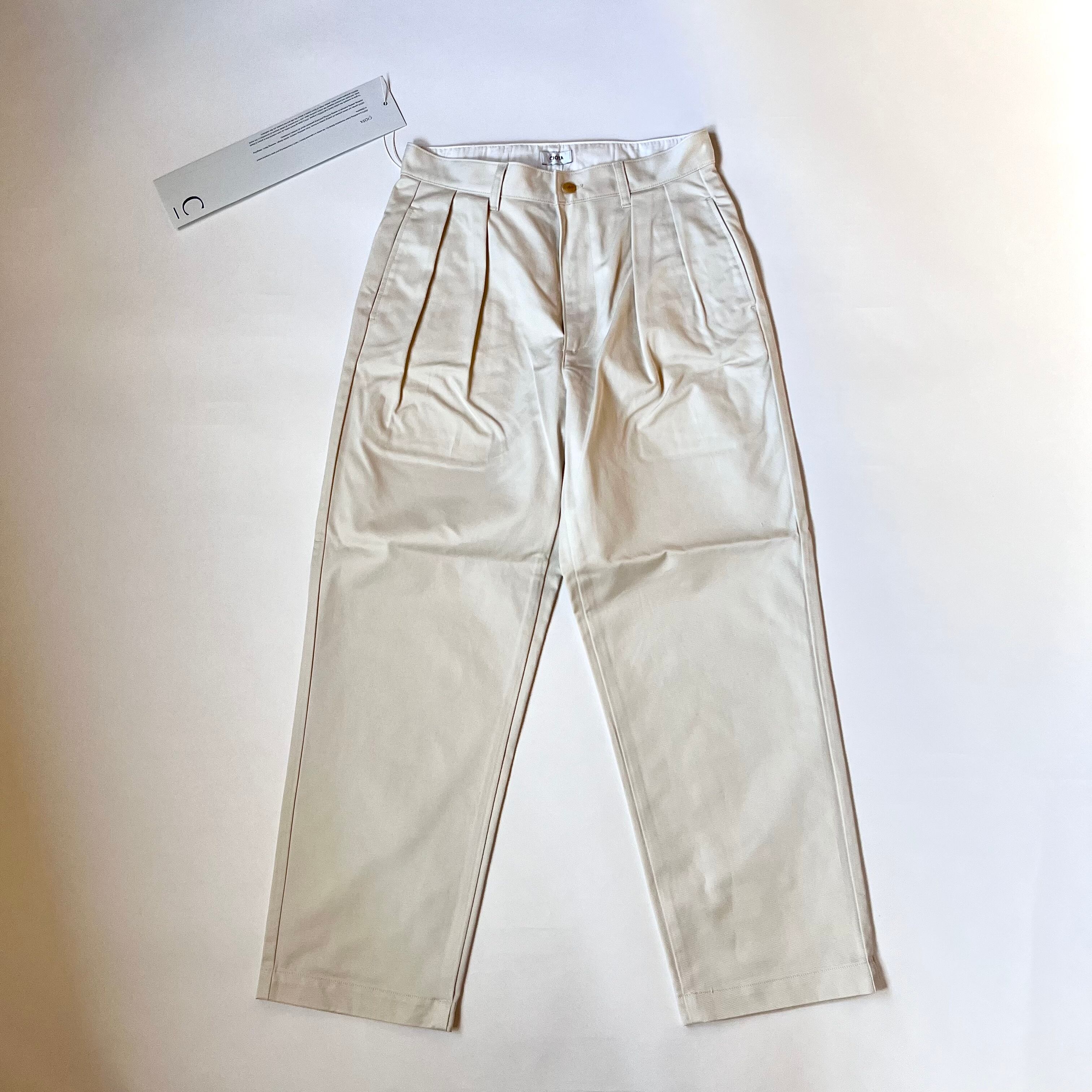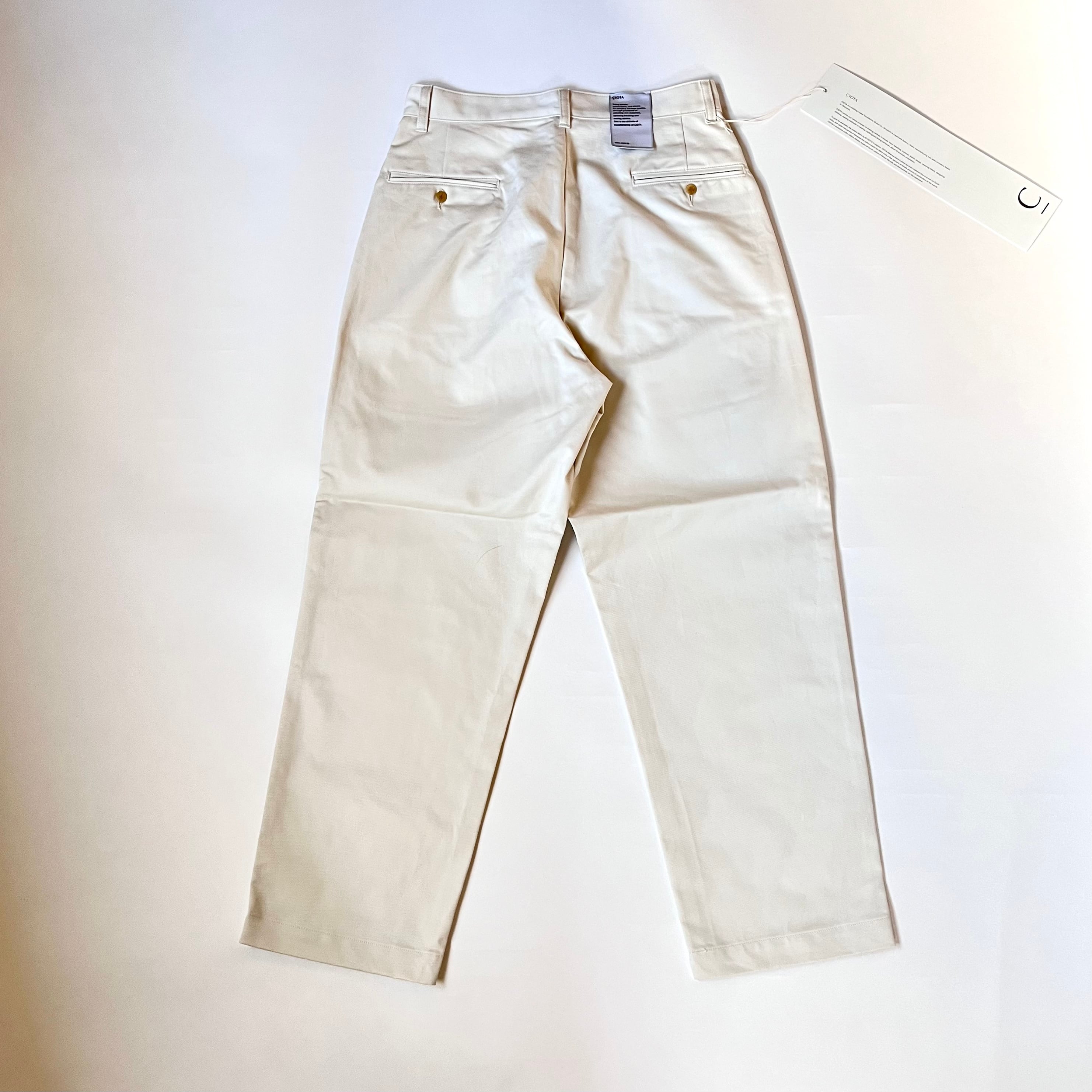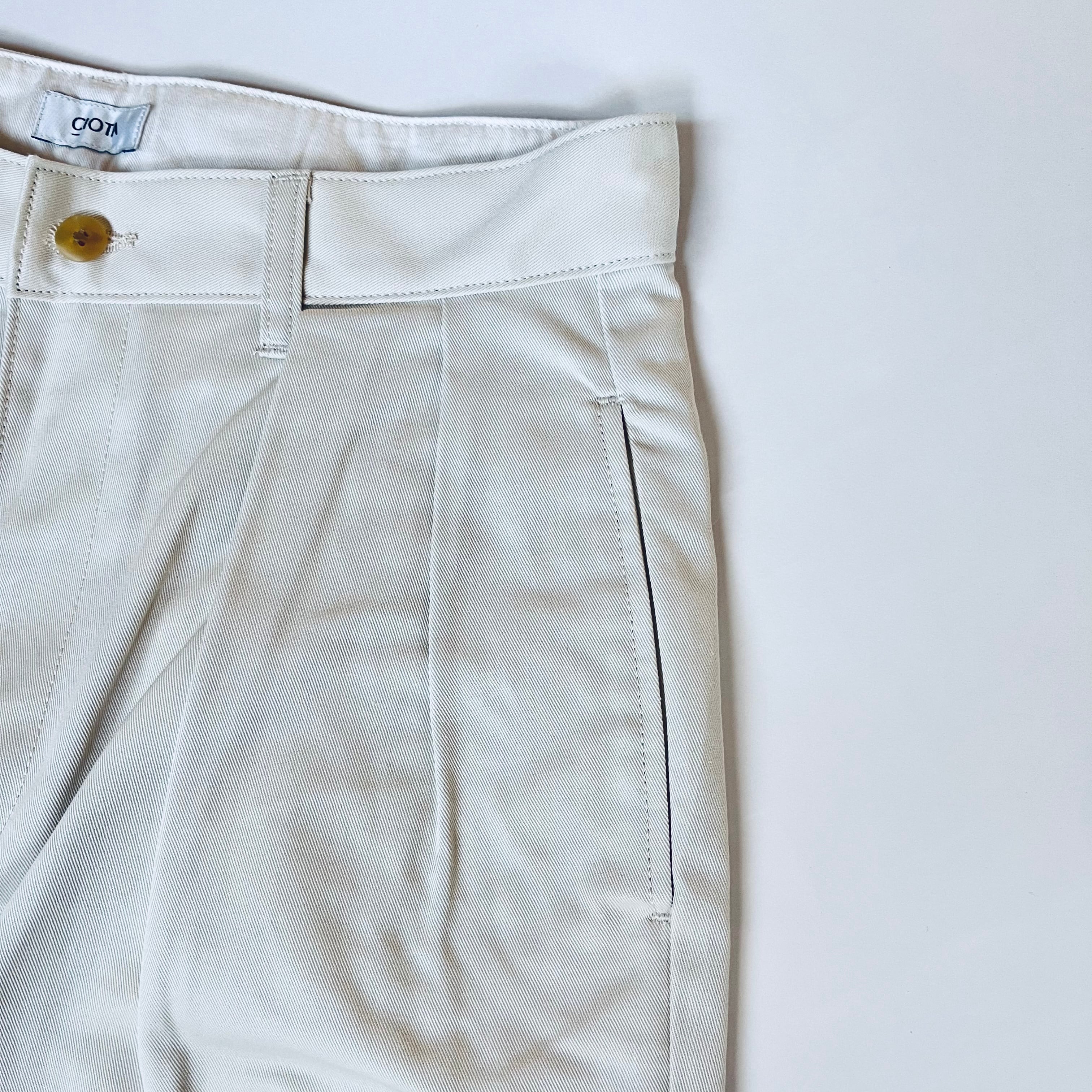 2タックのチノトラウザーズはワイドなテーパードシルエット。アメリカントラディショナルブランドの1980年代モデルをサンプリングしたデザインです。たてに20番手、よこに10番手のスビンコットンを使用し、ヴィンテージの風合いを表現しました。高密度に織り上げていますが、その感触はスビンコットンならではのしなやかさ。使い込んで洗いがかかると、さらにしっとりと柔らかくなっていきます。