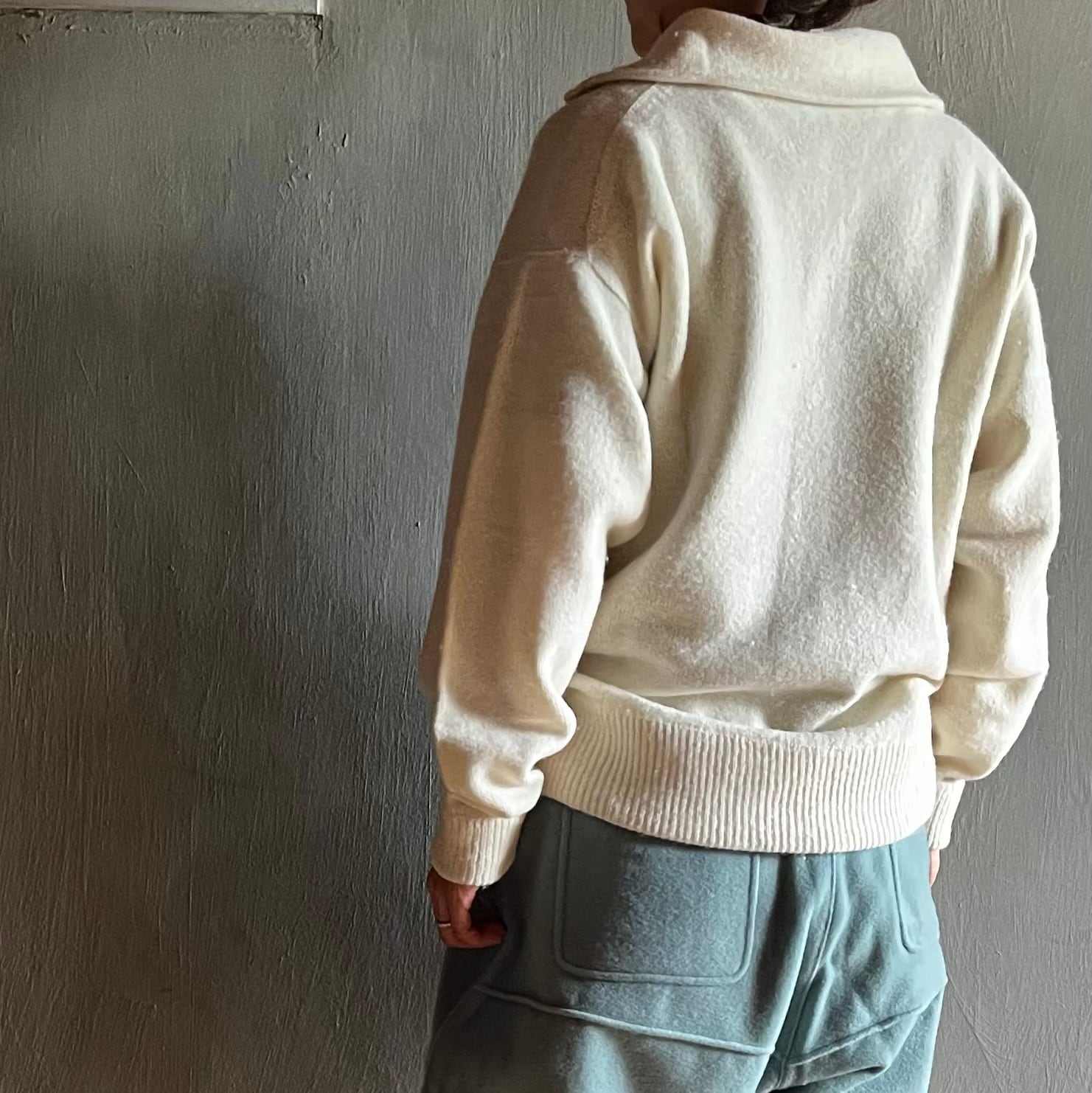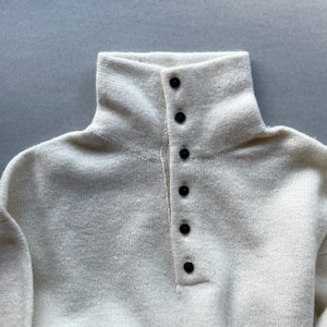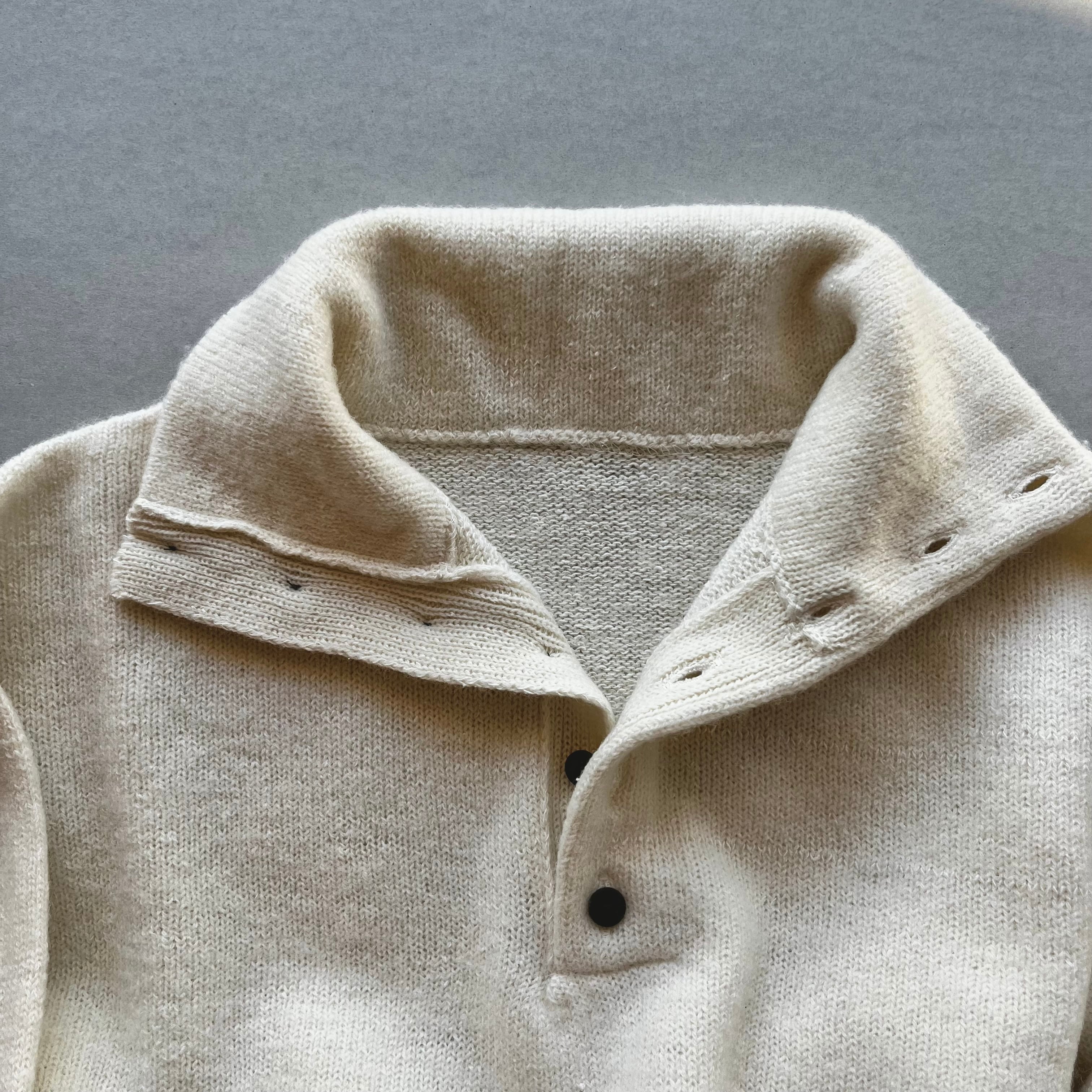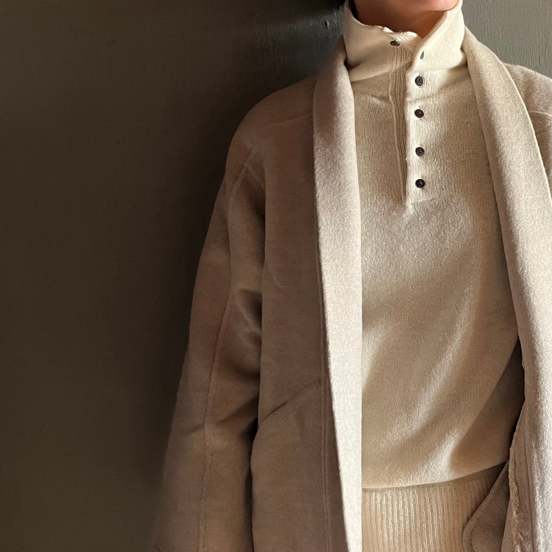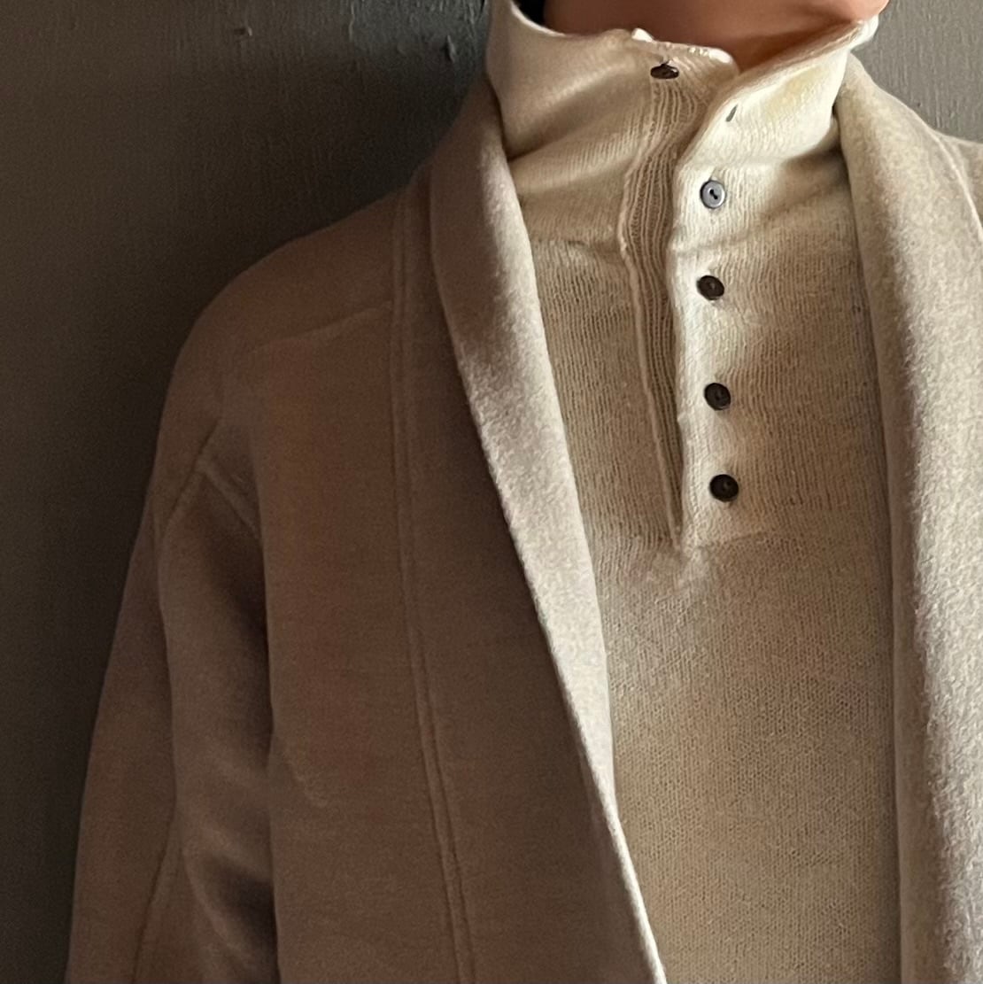 ネックに並んだボタンを調整することで、気候や好みに応じて襟の形状を自由に変えられる機能的なデザインです。程よいゆとりを持たせており、肩と脇には編地を変えてラインを入れています。ボタンにはタチ貝を使用しています。